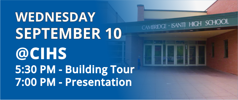 Cambridge-Isanti Schools has much to celebrate! Our students achieve at high levels in academics, arts, and activities—success made possible by the dedication of our staff, the partnership of families, and the ongoing support of our community. The funding approved in 2021 strengthened our schools by supporting student learning, attracting and retaining quality staff, and keeping class sizes low. Now, it is time to focus on the facilities that serve our students every day.